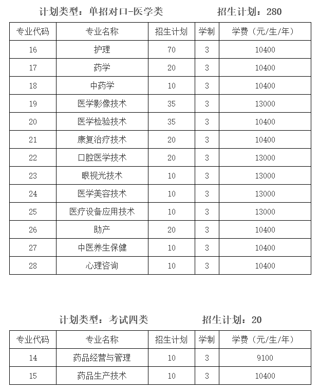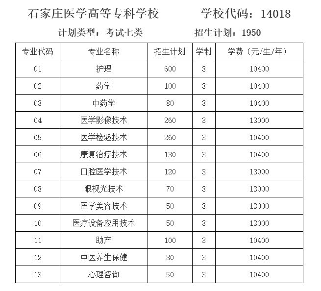 石家莊醫學高等專科學校2022年招生計劃