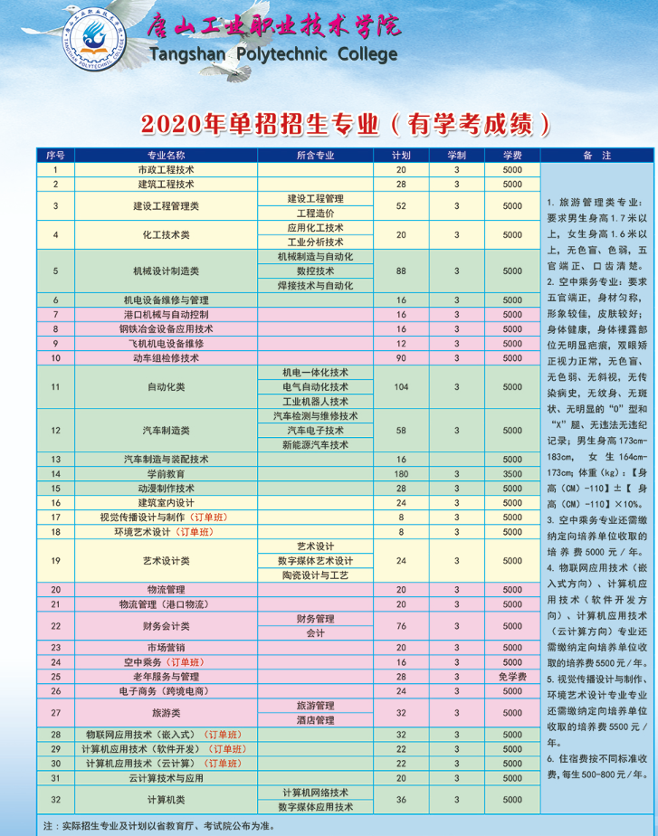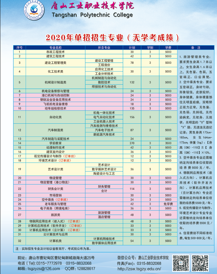 唐山工業職業技術學院2022年單招計劃